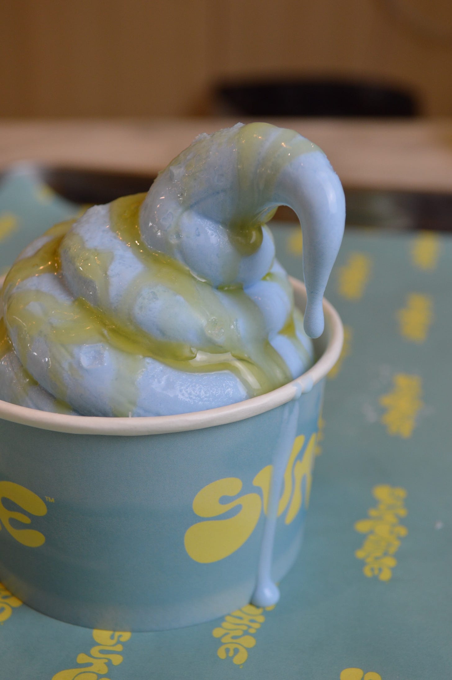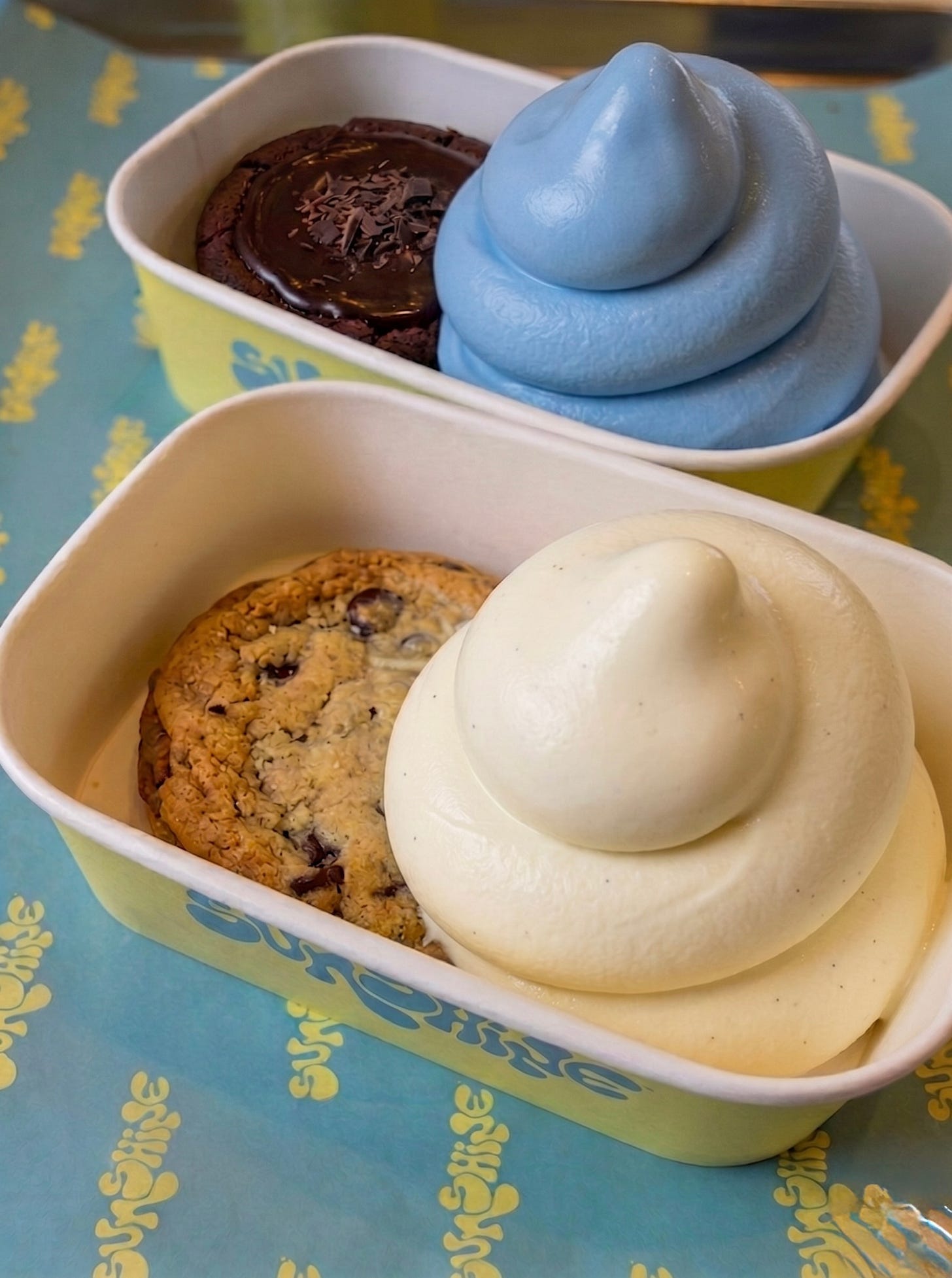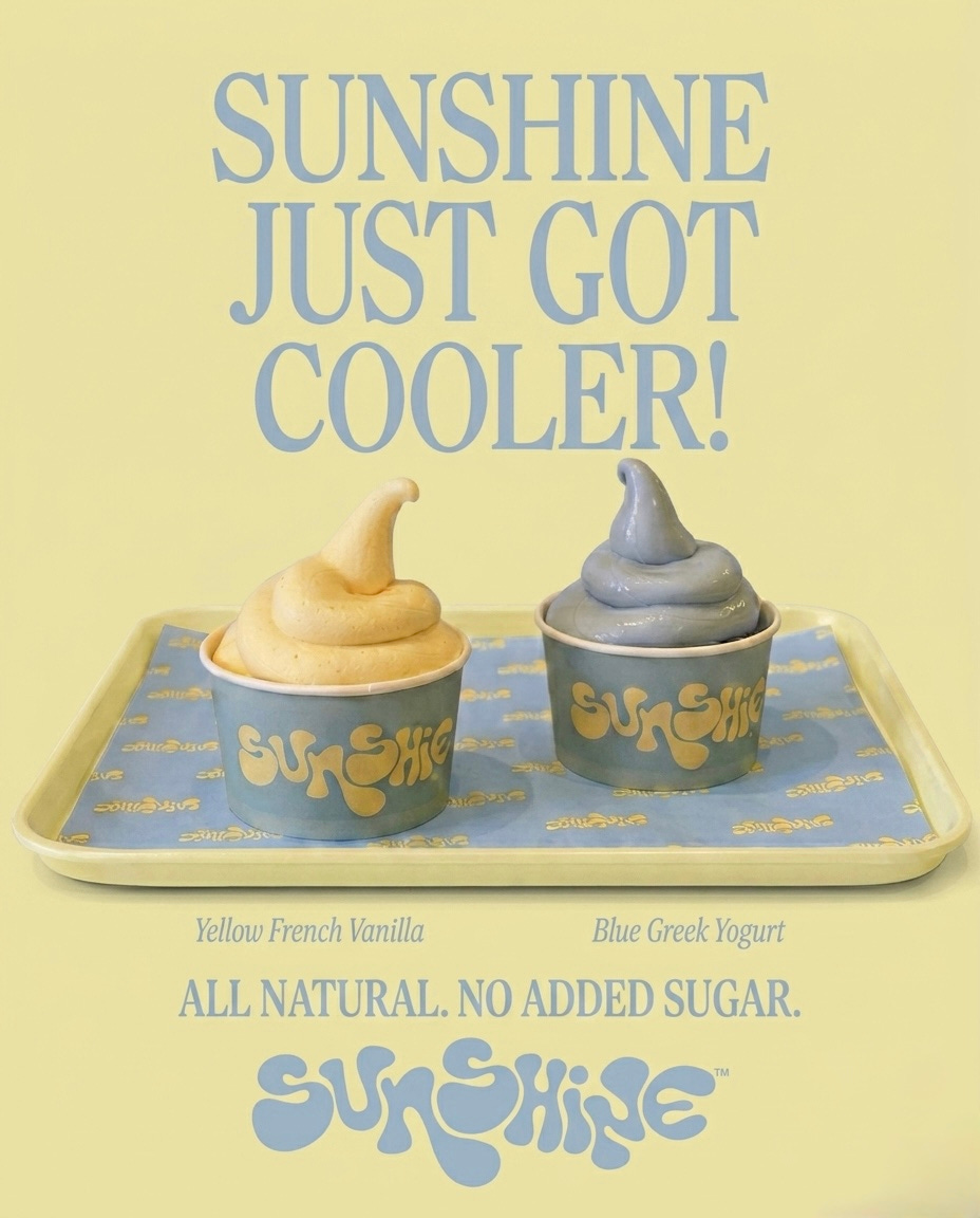 Sunshine just launched soft serve. Two flavors in their brand colors, just like everything else. Yellow, French vanilla, no sugar added. Blue, all-natural Greek yogurt blended with spirulina. No junk. Just simple, clean, nourishing ingredients that happen to taste like the best thing you’ve ever had.
