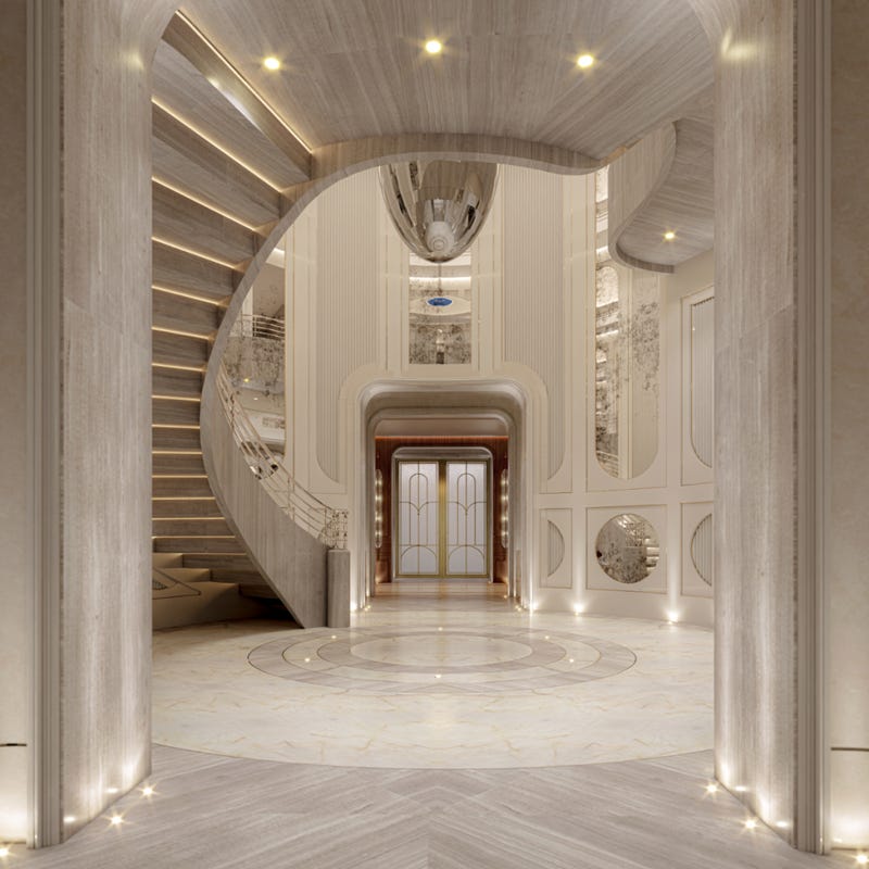 Envisioned by world-renowned designer Ferris Rafauli, the estate is a study in sculptural beauty and modern mastery. From its grand limestone façade and monumental architectural proportions to its meticulously curated interiors, every detail reflects uncompromising craftsmanship. A sweeping staircase rising beneath a 38-foot skylight creates a dramatic centerpiece, pulling natural light into the heart of the home and setting the tone for the residence’s classical-yet-contemporary aesthetic.